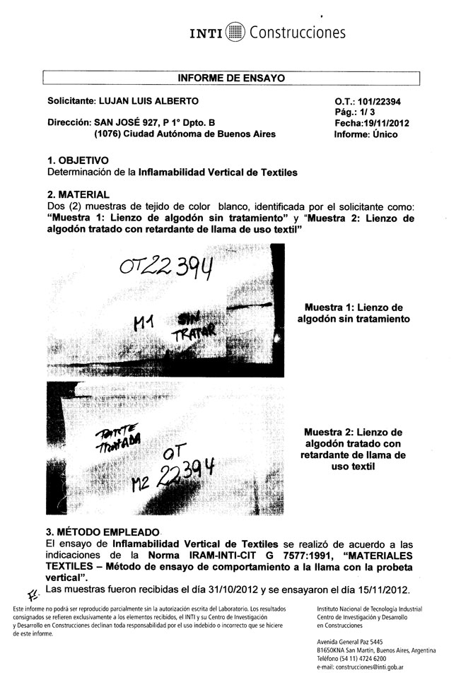 Periódicamente se realizan pruebas y ensayos de inflamabilidad vertical en el INTI a fin de verificar la calidad y eficacia de los mismos. (Ver Certificado)
