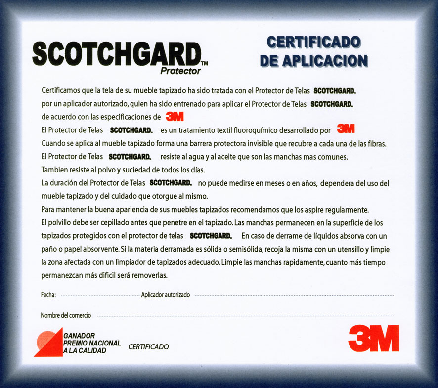 AL FINALIZAR LOS TRABAJOS SE ENTREGA UN CERTIFICADO DE APLICACION DEL PROTECTOR DE TELAS SCOTCHGARD (Ver Certificado)